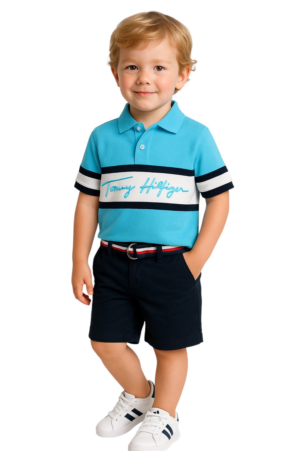 Polo infantil em malha piqué de algodão, manga curta, gola clássica em ribana e vista com 2 botões no tom do corpo. Corpo em aqua/turquesa com faixa branca horizontal no peito, delimitada por filetes azul-marinho ao redor. Nas mangas, repetição do motivo com faixa branca e filetes navy. Logo script “Tommy Hilfiger” grande, centralizado sobre a faixa branca, na mesma cor aqua do corpo. Barra reta com fendas laterais e costas levemente mais longas (drop-tail) com reforço vermelho discreto. Pespontos tonais e acabamento premium.