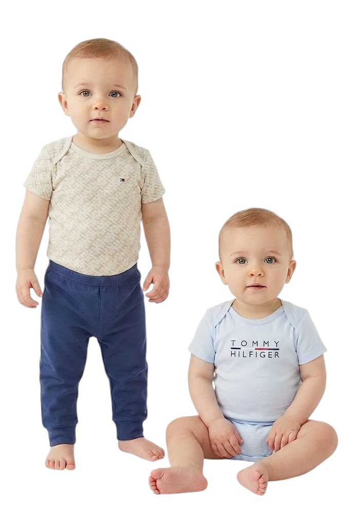 Trio Tommy Hilfiger para bebê, composto por 2 bodys de manga curta e 1 calça, desenvolvido para proporcionar conforto absoluto, praticidade e um visual sofisticado, mantendo o padrão premium da marca.