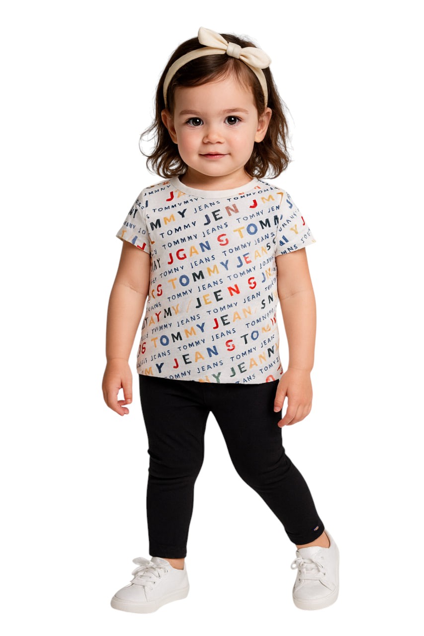 Conjunto com camiseta e legging Tommy Hilfiger , camiseta com letras coloridas e com legging preta