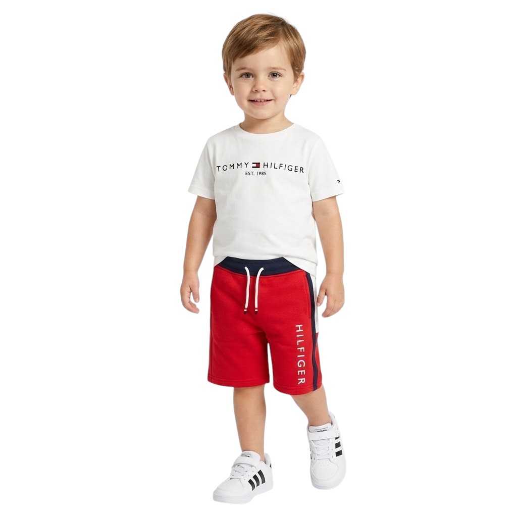 • BermudaTommy Hilfger em Moletom , confortavél com cos elastico e cordão funcional, logo da marca na lateral , bolso laterais recorte lateral em vermelho e branco