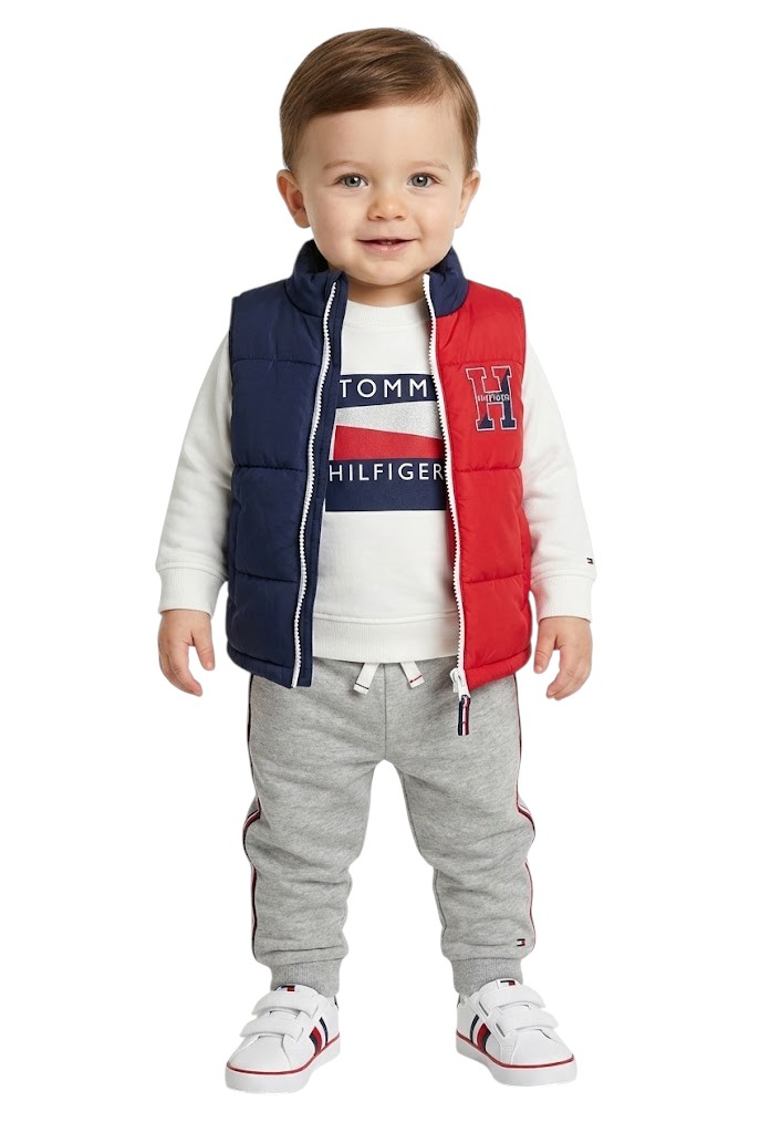 • Lindo conjuntoTommy Hilfiger para os dias mais frio, camiseta em malha,  calça em moletom e colete combinando, Inclui colete puffer vermelho e azul, camiseta branca de manga comprida e calça jogger cinza (três peças no total),  Texto gráfico (colete): Hilfiger, Camiseta : Tommy Hilfiger.