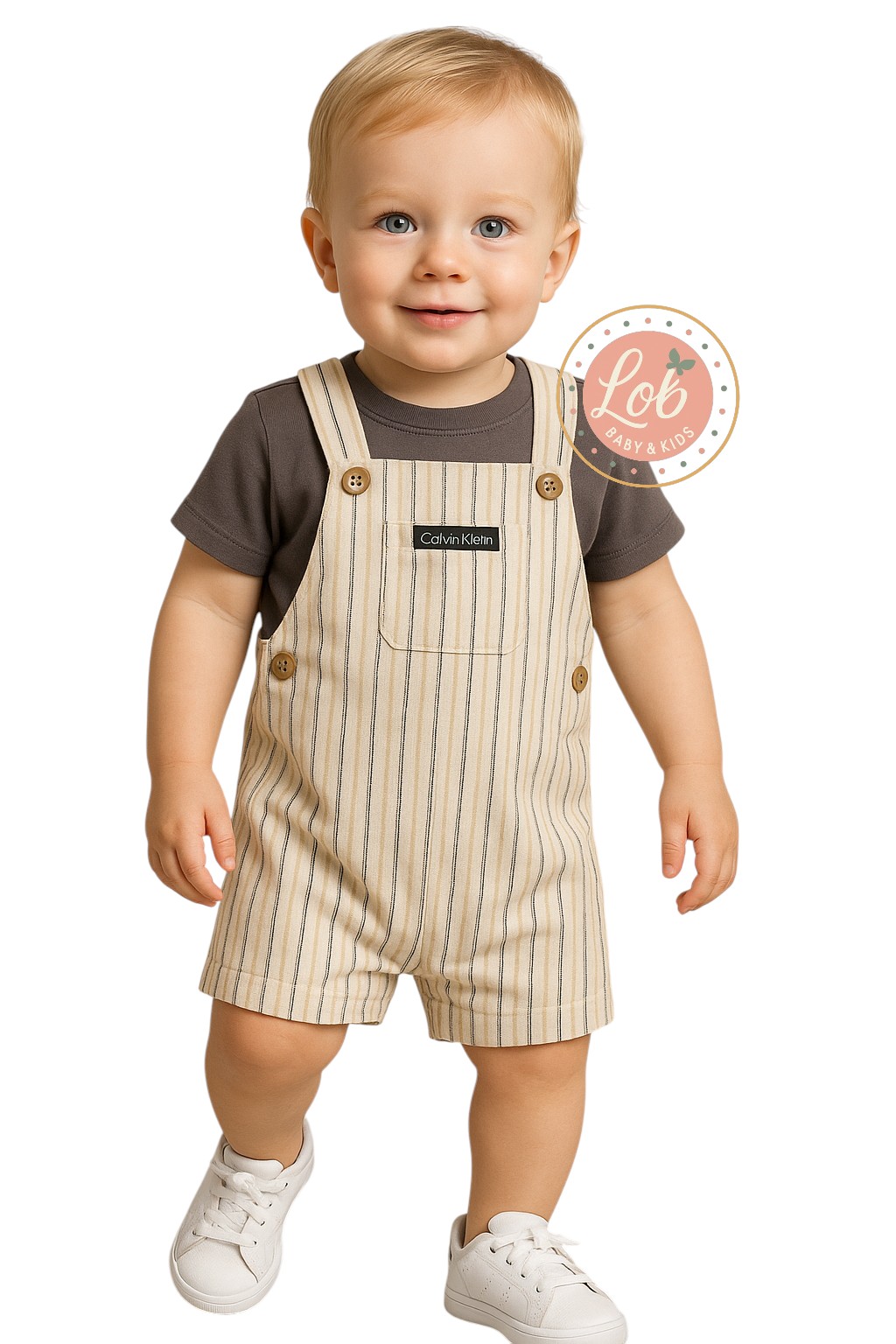 • Jardineira e camiseta Calvin Kelin,  Jardineira em algodão, tecido macio e confortavel, bege com listras   coordenado com camiseta de cinza escuro em algodão.