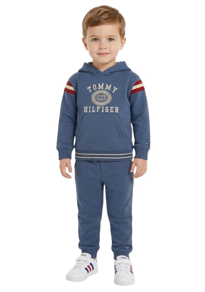 O conjunto infantil Tommy Hilfiger é perfeito para garantir estilo e conforto. O moletom flanelado com capuz é superconfortável, com um bolso canguru prático e o logo da marca bordado no peito, oferecendo um visual casual e moderno. Ideal para manter os pequenos aquecidos com muito estilo.