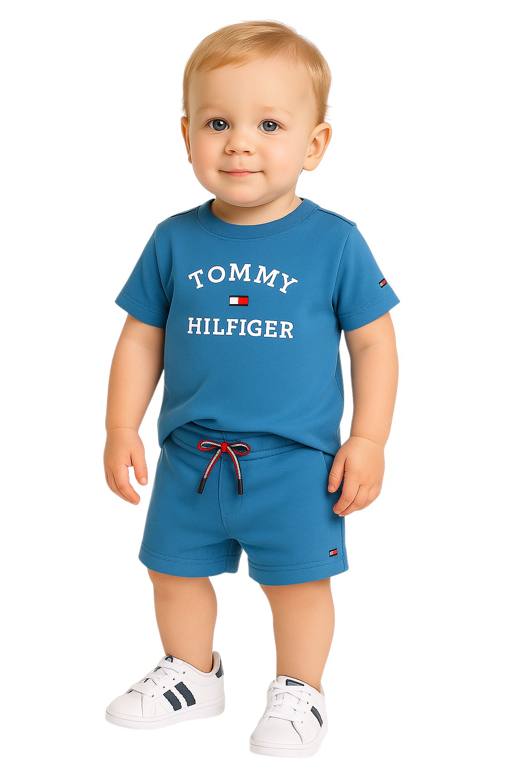 Conjunto Tommy, com camiseta azul em malha macia com escrita TOMMY HILFIGER e bandeirinha ao centro. Shorts em moletinho no mesmo tom, cós elástico com cordão tricolor e mini bandeirinha na perna. Conjunto leve e confortável para o dia a dia.