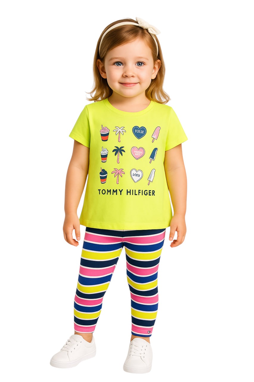 Conjunto feminino infantil da Tommy Hilfiger com camiseta em malha 100% algodão e legging listrada em malha de algodão com elastano. Visual colorido e confortável para o dia a dia.