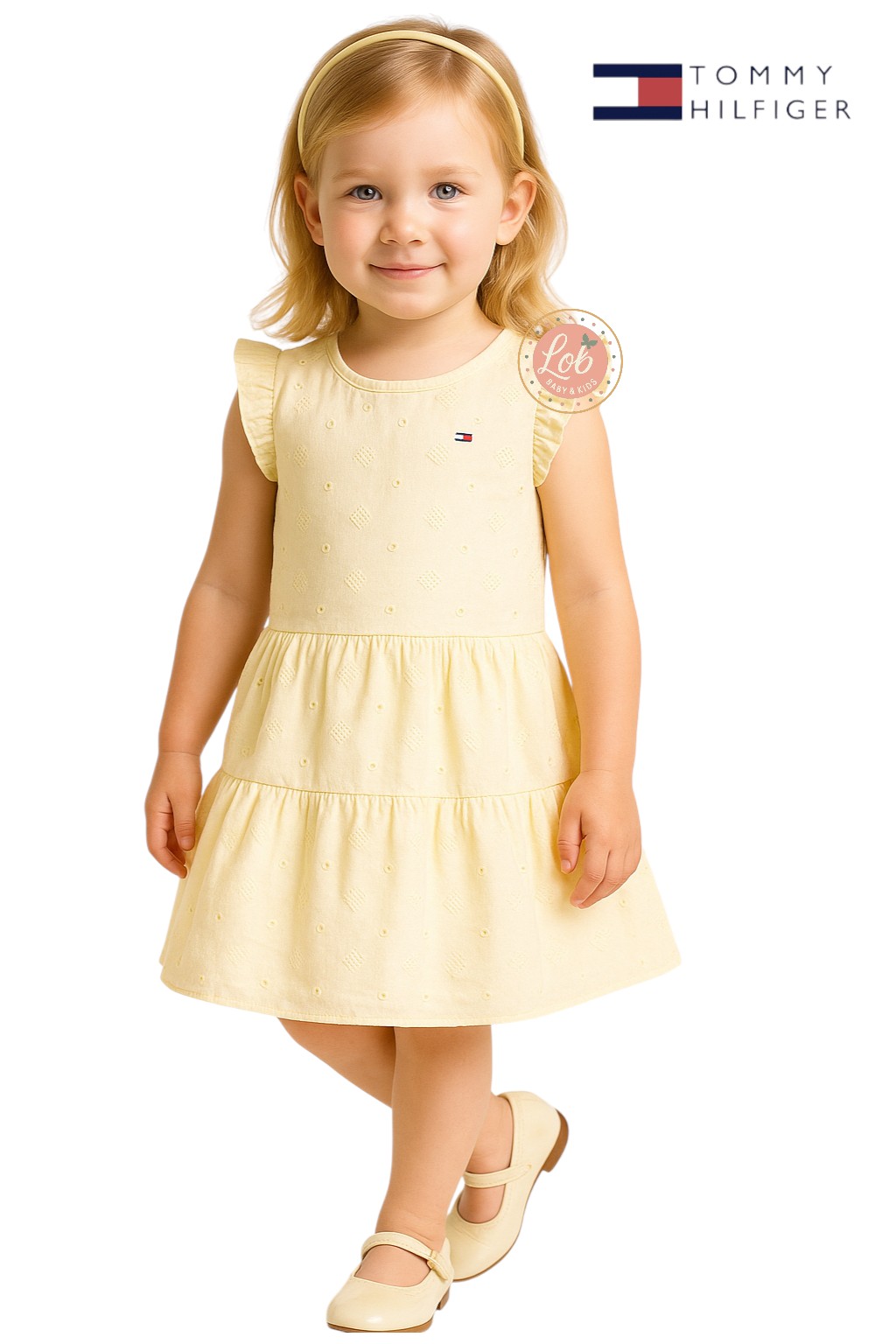 • Vesrido amarelo pastel do clássico evasê em laise 100% algodão, com monograma TH tonal. Decote redondo, babadinhos nas cavas, saia em duas camadas com bom volume, logo-bandeirinha no peito e  Acabamentos e fechamento por botão,   totalmente forrado