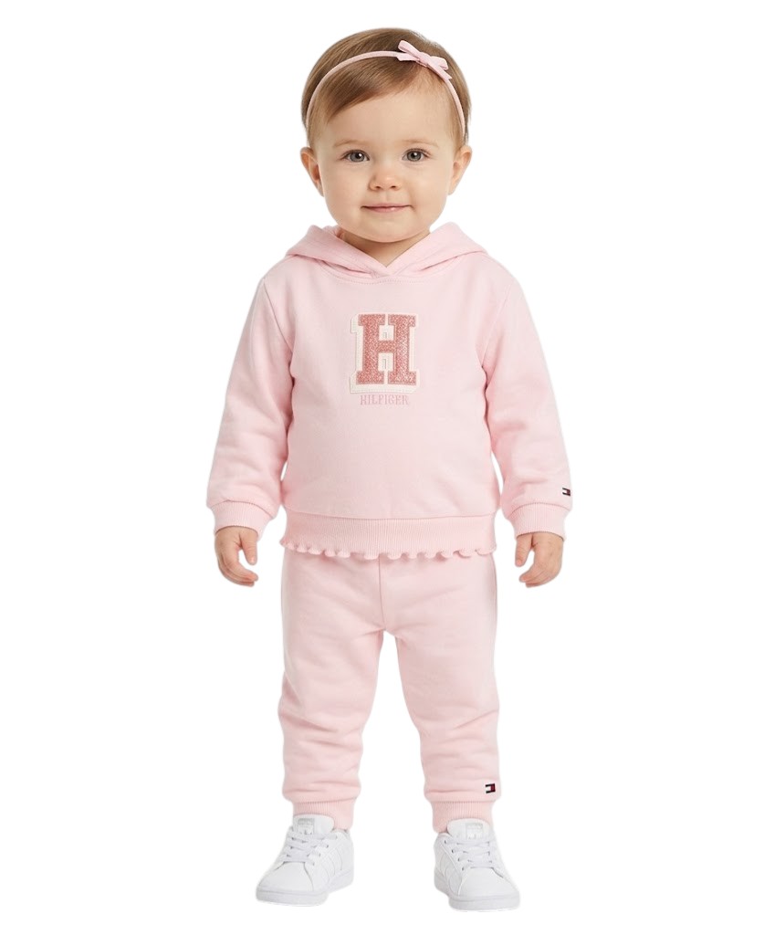 Este conjunto Tommy Hilfiger é confeccionado em moletom fleece macio, ideal para os dias mais frios, mantendo o conforto e o estilo dos pequenos. A blusa de manga longa, com capuz, possui o logo "H" brilhante estampado no peito, combinado com a qualidade e o design da Tommy Hilfiger. A calça possui cós elástico e dois bolsos frontais, além de um design prático para o dia a dia.