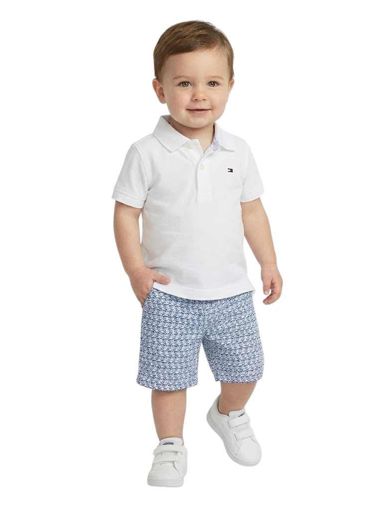 Camisa gola Polo clássica masculina para bebê Tommy Hilfiger, manga curta na cor Branca . Confeccionada em Piquet. Modelagem regular com a logo bordada no peito do lado esquerdo, com 2 botões personalizados, gola e barra das mangas em malha canelada.