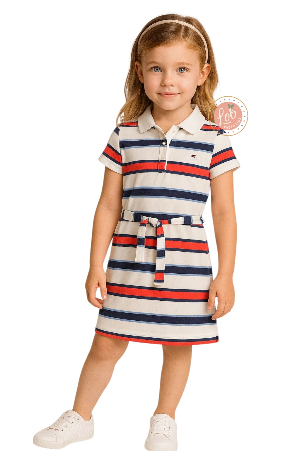• Vestido Tommy Hilfiger gola polo, com 3 botões, listras coloridas e logo da arca. Ano após ano, vestido polo continua sendo um sucesso, queidinho das mamães.