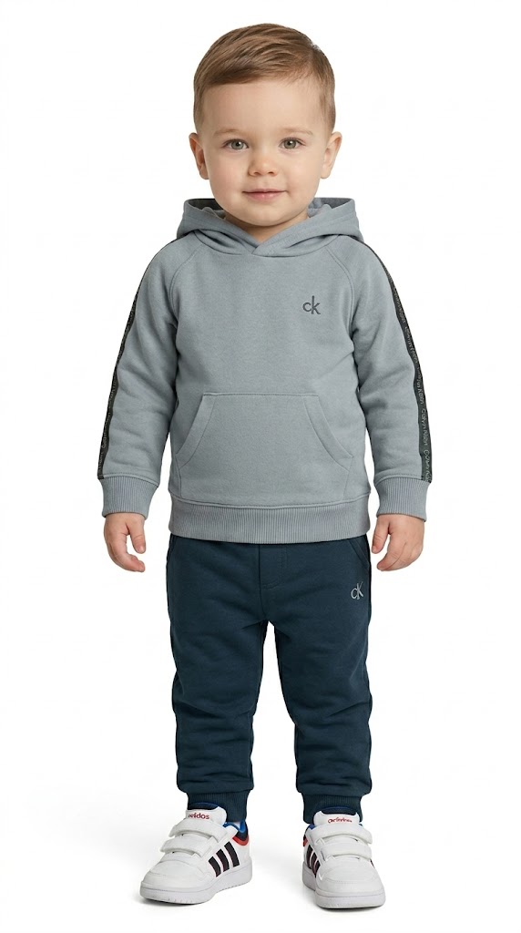 Este conjunto bebê da Calvin Klein oferece estilo e conforto com um toque moderno e esportivo. A blusa de moletom com capuz apresenta o logo "CK" estampado no peito e detalhes na manga com o nome da marca em fita. A calça, combinando com a blusa, tem cós elástico, punhos canelados e o logo "CK" próximo ao tornozelo, garantindo um ajuste confortável e prático. O tecido em moletom com fleece proporciona um aquecimento suave e macio, ideal para os dias mais frios.