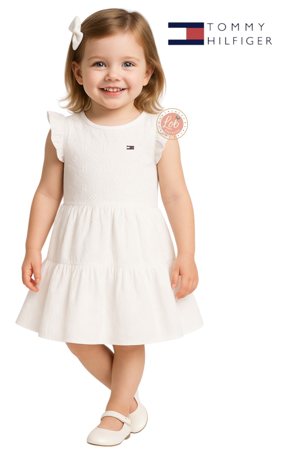 • Vestido evasê 100% algodão em laise (bordado inglês) com monograma TH tonal por toda a peça. Decote redondo, babadinhos nos ombros, saia em duas camadas franzidas, logo-bandeirinha no peito  Pespontos tonais e bainha reta.  com abertura na parte de tráz, fechamento por botão,   totalmente forrado