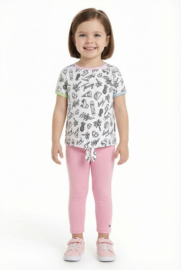 Conjunto infantil feminino composto por camiseta e legging, ideal para o dia a dia com conforto e estilo. A camiseta é confeccionada em malha macia na cor branca, com estampa divertida em traço preto composta por ícones variados e assinatura Tommy Hilfiger, além de gola redonda e mangas curtas com acabamento contrastante em tons suaves. Possui detalhe de amarração frontal na barra, que garante um visual moderno e descontraído.